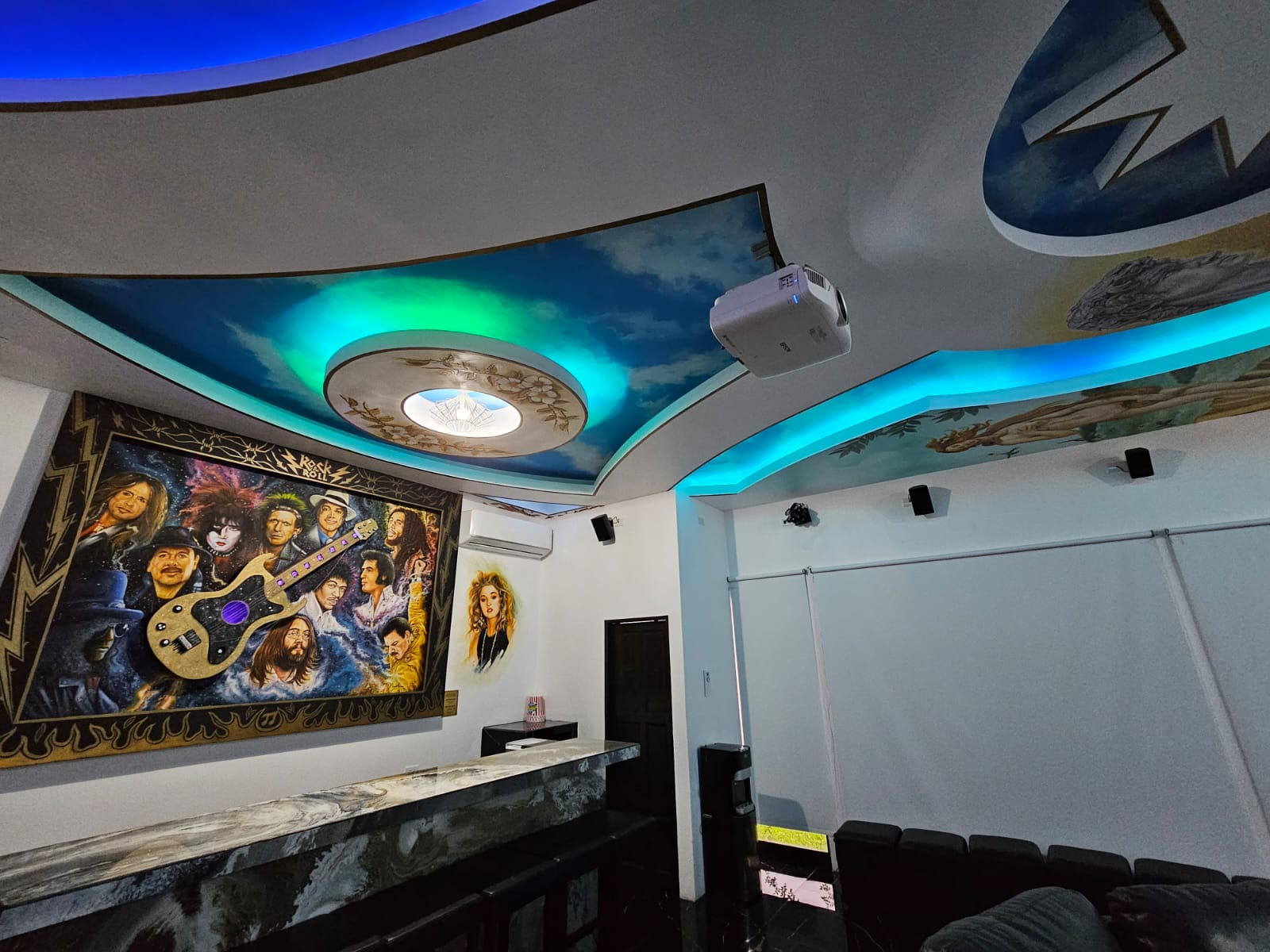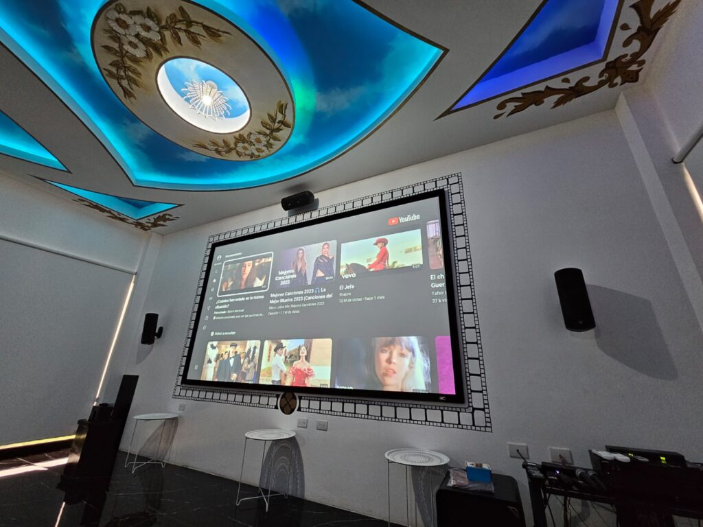Proyecto privado en Alajuela, cine con Karaoke y Bar, todo en el mismo salón, estas 3 condiciones hacen que la escogencia de los parlantes varie de los comunes de cine a parlantes que tengan una alta fidelidad pero que soporten un nivel de volumen para poder cantar, escuchar un concierto de Rock, o subir el volumen para ponerse a bailar, un poco complicado, verdad?